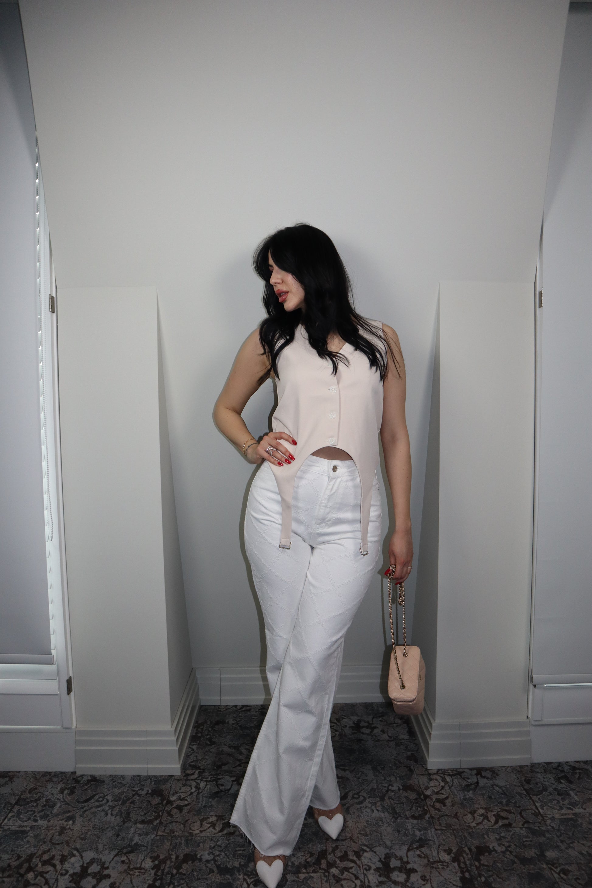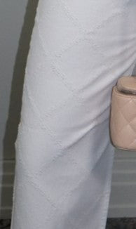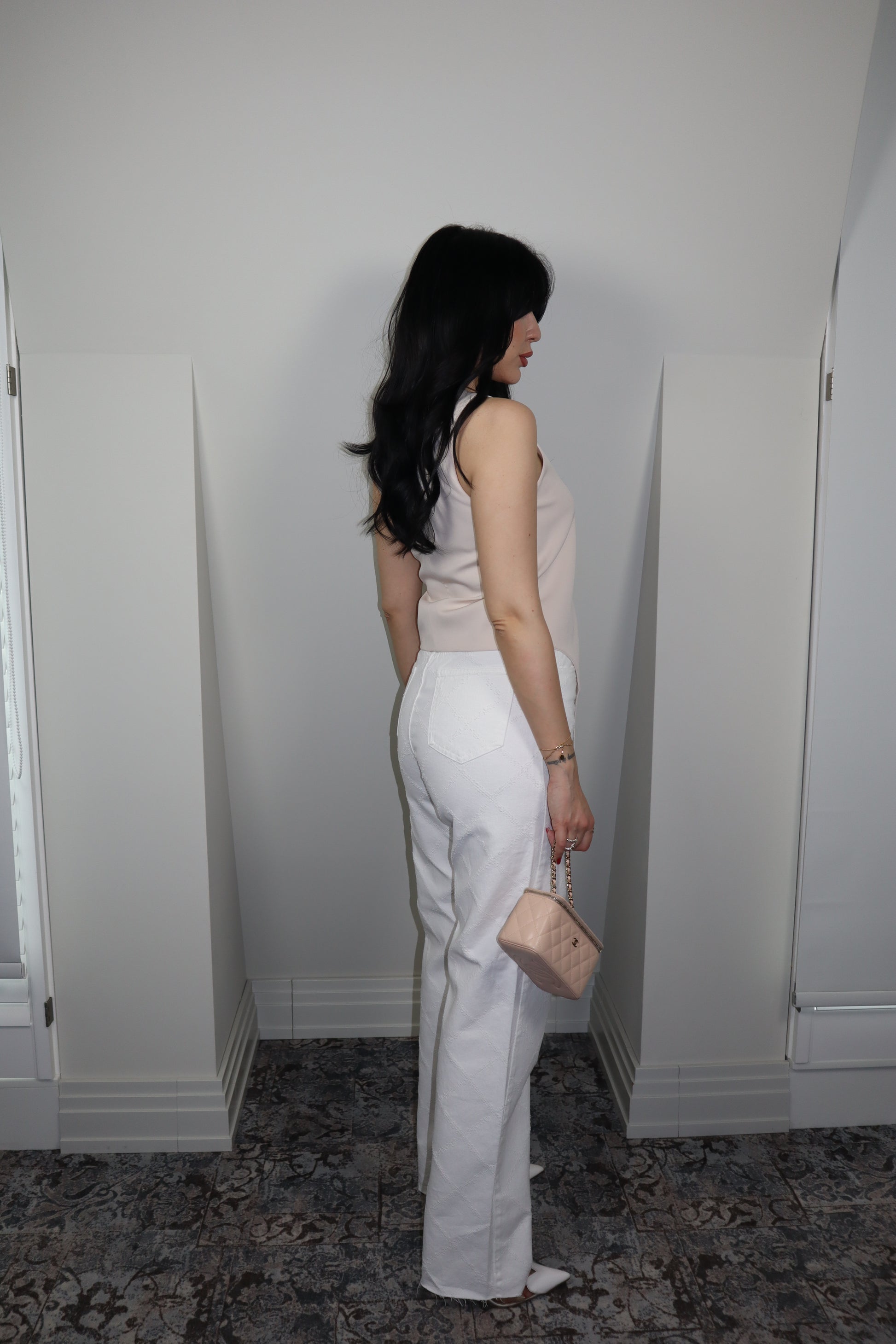 Бели дънки с висока талия и прав силует, изработени от 100% памук. Моделът е завършен с фини детайли върху плата.
