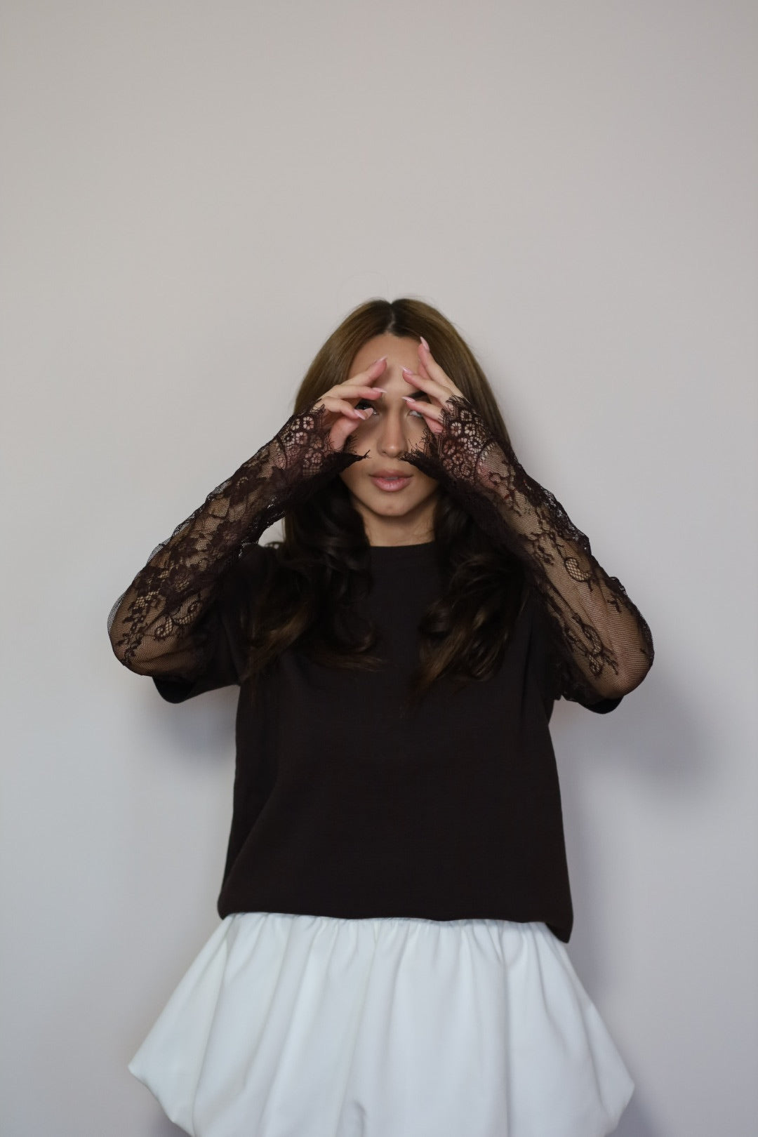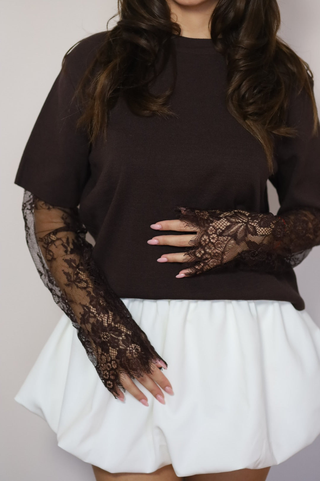 Кафява тениска с дантелени ръкави