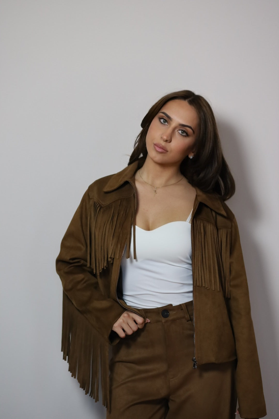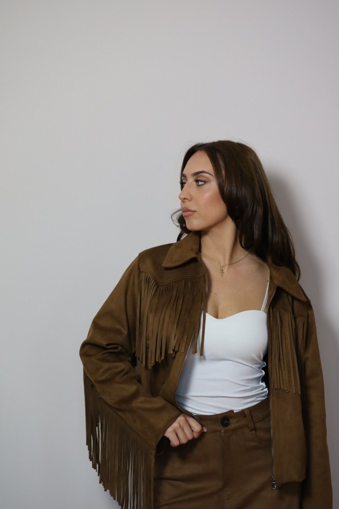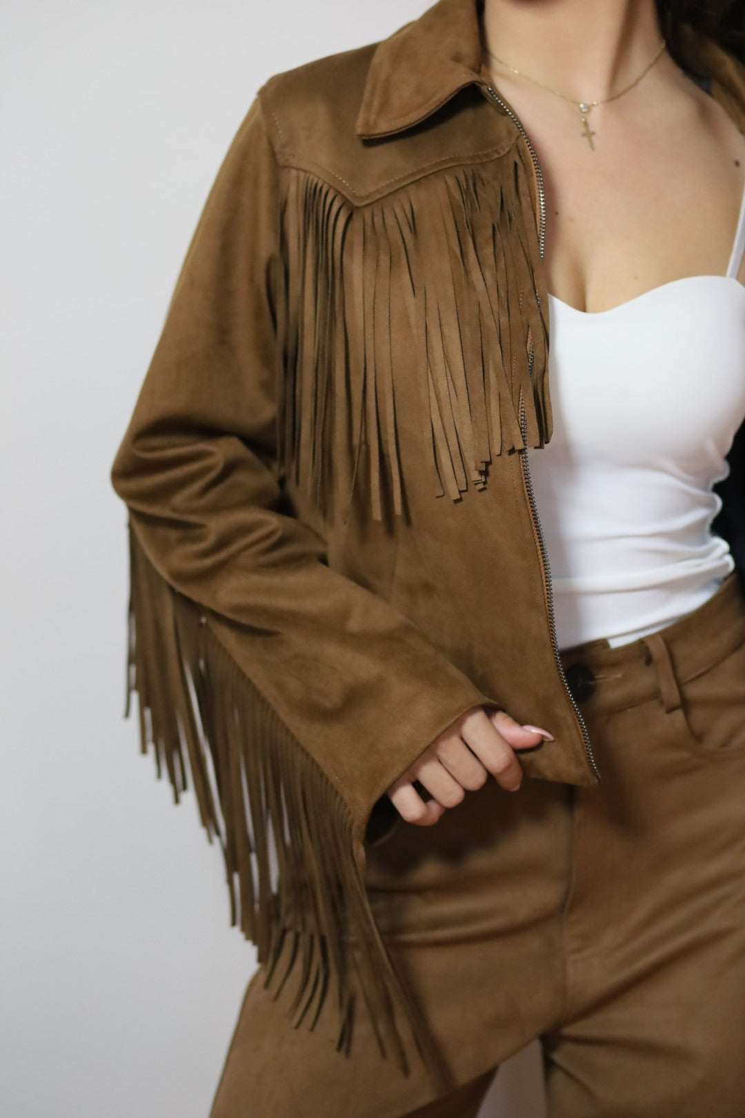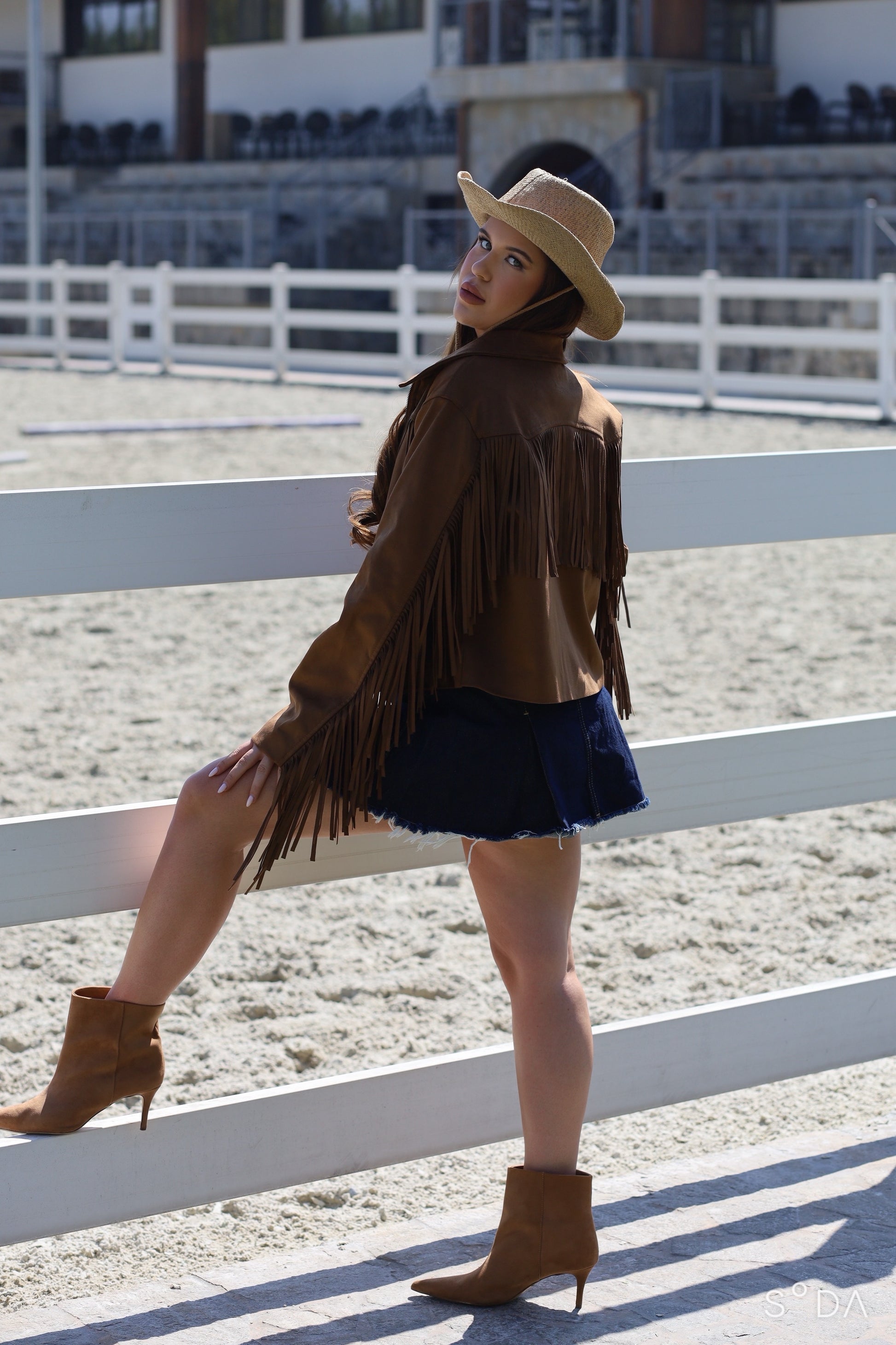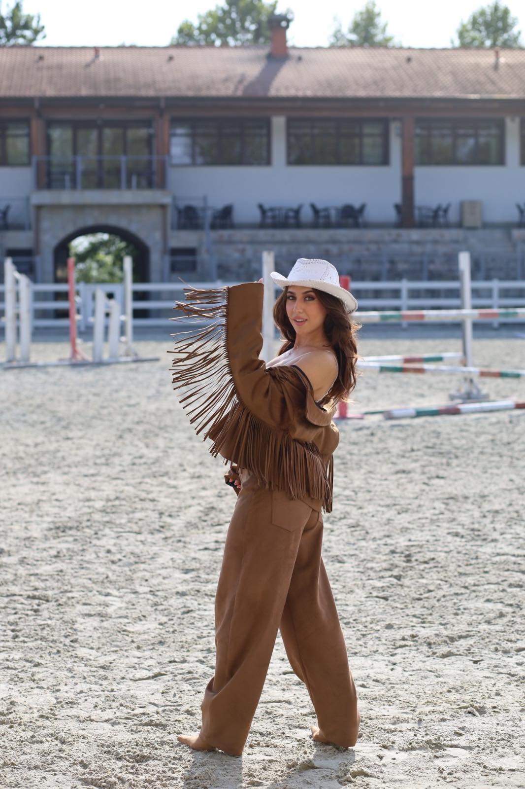 Кафяво яке от велур с ресни за стилен акцент, който придава динамика на визията. Подходящо за комбиниране както с дънки, така и с рокли за по-модерен и изразителен стил.